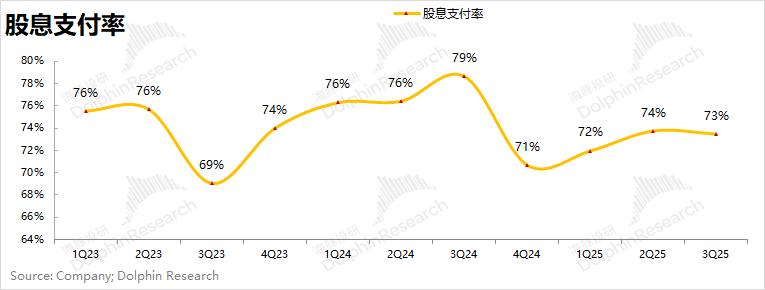 b)分红情况:公司本季度分红回购541亿元,与海豚君此前的预期(535亿元)相近。由于公司通常在二季度/三季度进行分红,进而测算公司当前的股息支付率维持在73%附近。