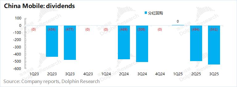 3、资本开支:再次缩减。中国移动2025年第三季度的资本开支大约为416亿元,同比减少18亿元。结合公司全年目标看,公司预期2025年资本开支为1512亿元,进而推测公司四季度的资本开支约为350亿元左右,将再缩减相应投入力度。