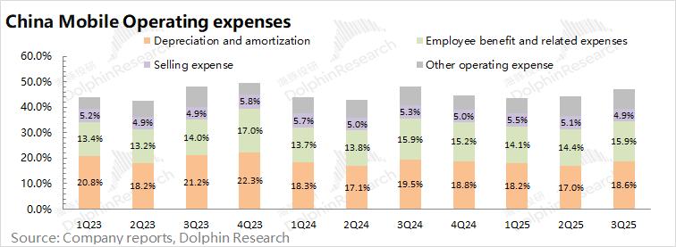 中国移动2025年第三季度经营费用1181亿元,同比增长0.5%,保持平稳。海豚君将“销售费用”、“雇员薪酬费用”、“折旧及摊销”和“其他营运支出”四项都放在经营费用中;