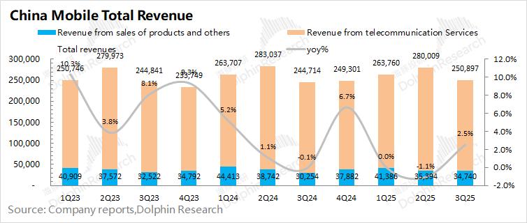 中国移动2025年第三季度总营收2509亿元,同比增长2.5%。分项来看,其中公司本季度来自于通讯服务的收入为2162亿元,同比微增0.8%;来自产品销售及其他的收入为347亿元,同比增长14.8%,是公司本季度增长的主要推动力。