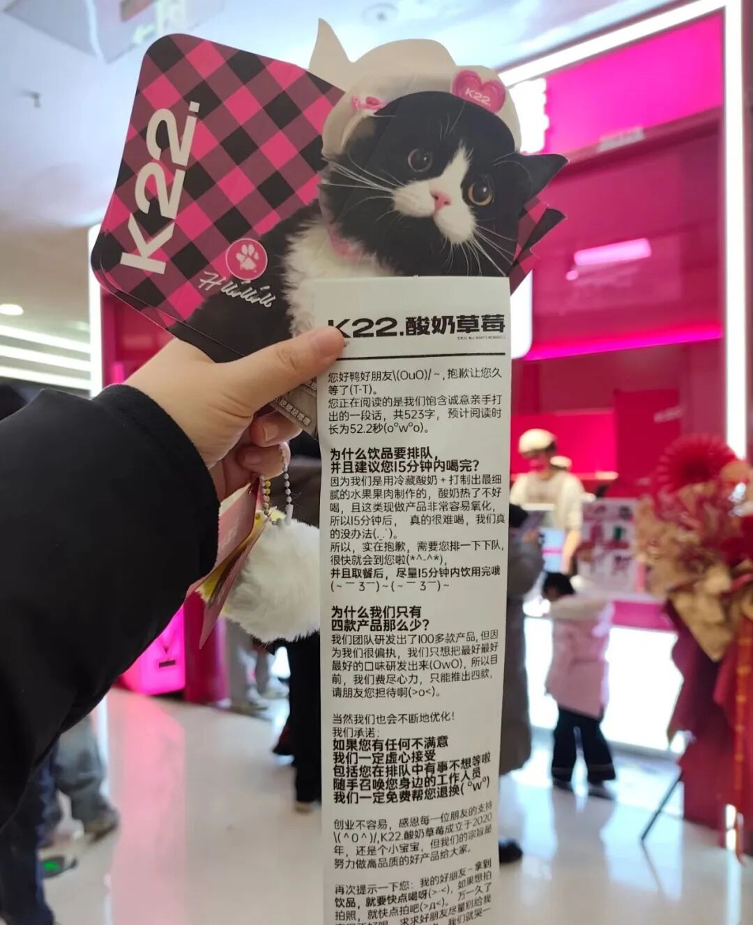 比如K22和茶颜悦色的“小票文学”整体负面评价较多。去年开始,不少网友吐槽“K22小票比10个人吃海底捞都长”,原因在于K22在小票上详细解释了“为什么饮品要排队并且建议您15分钟内喝完”“为什么我们只有四款产品那么少”,甚至还贴心打上了“预计阅读时长为52.2秒”的提示,但不少消费者的评价是“废话连篇”“大可不必”。
