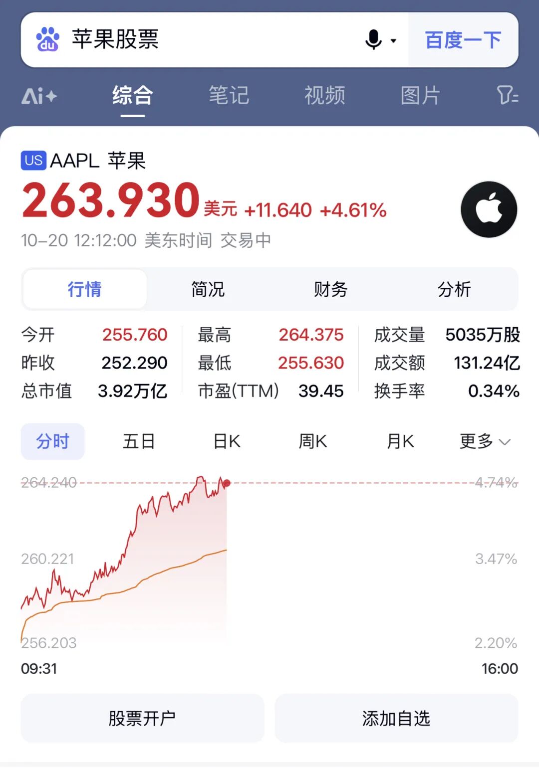 受益于iPhone 17系列全球热销,今日美股苹果股价创历史新高,报263.93美元,涨幅一度超4.5%,总市值超3.9万亿美元,一度达3.92万亿美元。