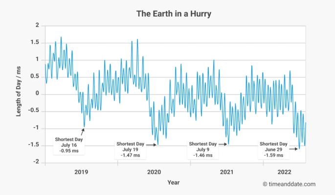 总体来说地球的每天都在变长,但在某些地质时期,它也会出现短期的加速,比如在过去2万年,每天大概变短0.6毫秒。