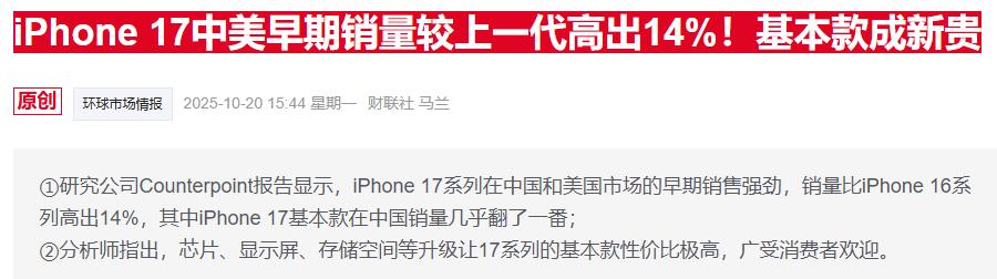 日内财联社报道也提到,研究机构Counterpoint Research的最新报告显示,iPhone 17在中国和美国两大市场上市后的10天内,销量比iPhone 16系列高出14%。