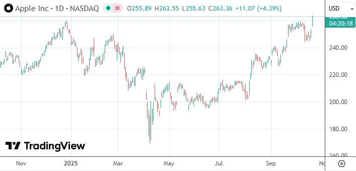 周一(10月20日)美股盘中,苹果公司股价涨超4%,最高报每股263.59美元,刷新历史新高,公司总市值也突破3.9万亿美元关口。