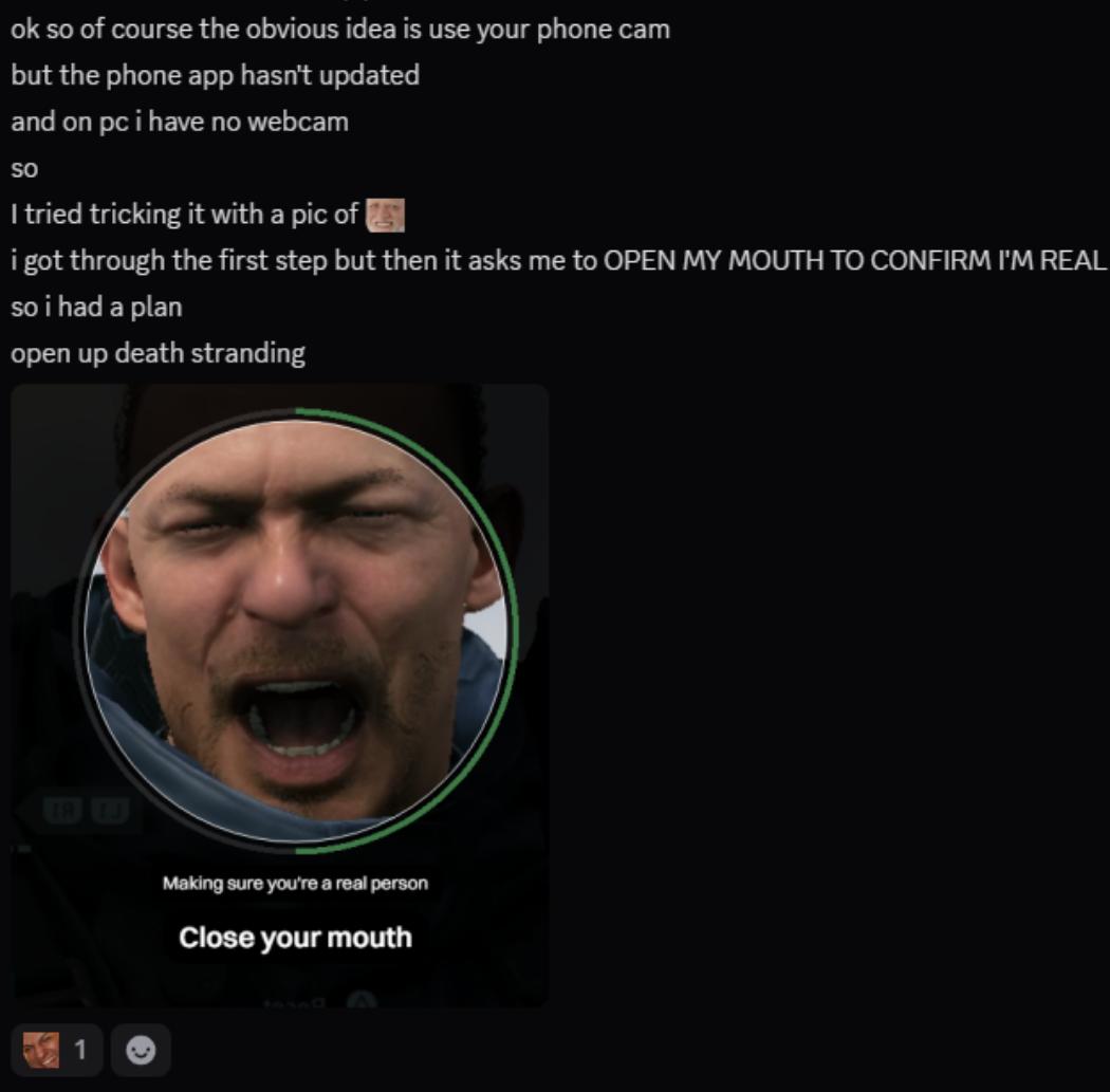 讽刺的是,距离新规生效还不到24小时,英国小登们便发现了技术漏洞,他们通过《死亡搁浅2》拍照模式中高度逼真的主角山姆(诺曼·瑞杜斯饰演)模型,得以轻松骗过验证系统。