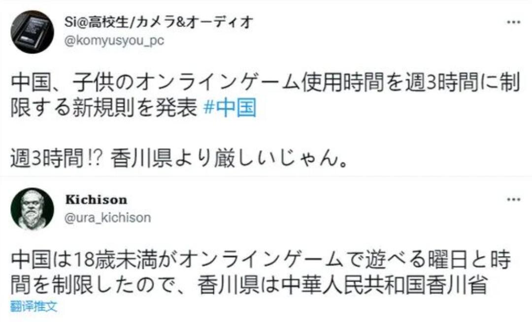 在2021年首次颁布“最严防沉迷”政策的时候,该新闻就已经在日本火过一次了,有人感慨中国管控未成年人网瘾的决心,也有人抽象地认为,既然中国执行了比香川县更严格的防沉迷措施,不如更名叫“中华人民共和国香川省”。