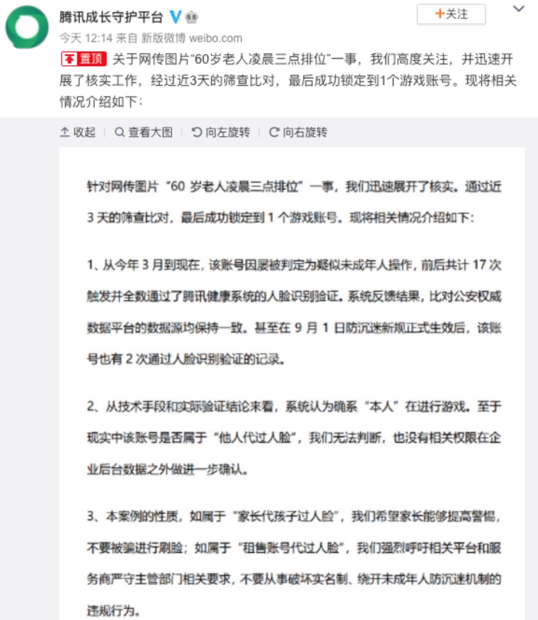当年“防沉迷”新规落地后,国家新闻出版署要求游戏公司将未成年人的游戏时间严格限制为一周仅3小时,结果很快就传出“60岁花甲老太太在凌晨三点排位用赵云拿五杀”的热门梗图,一度让腾讯像在公开唱反调,尴尬得不行。