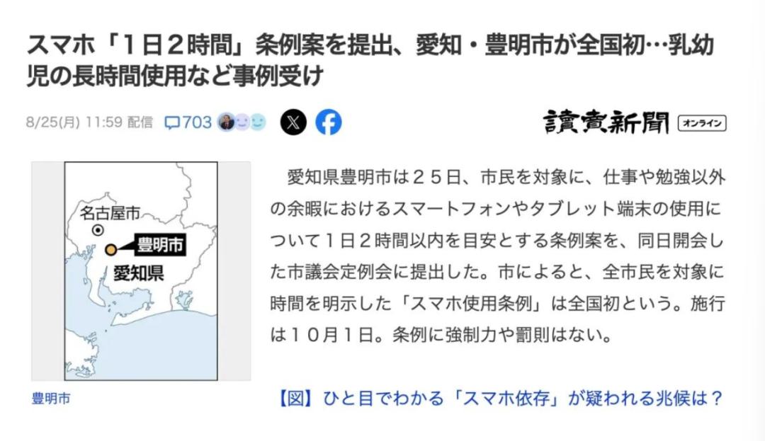 到了今年8月,日本爱知县政府更是提出了一项引发全日本热议的《智能设备使用限制条例(草案)》,该条例建议,除工作与学习外,成年人每日使用智能手机、平板电脑等智能设备的时间不得超过2小时。