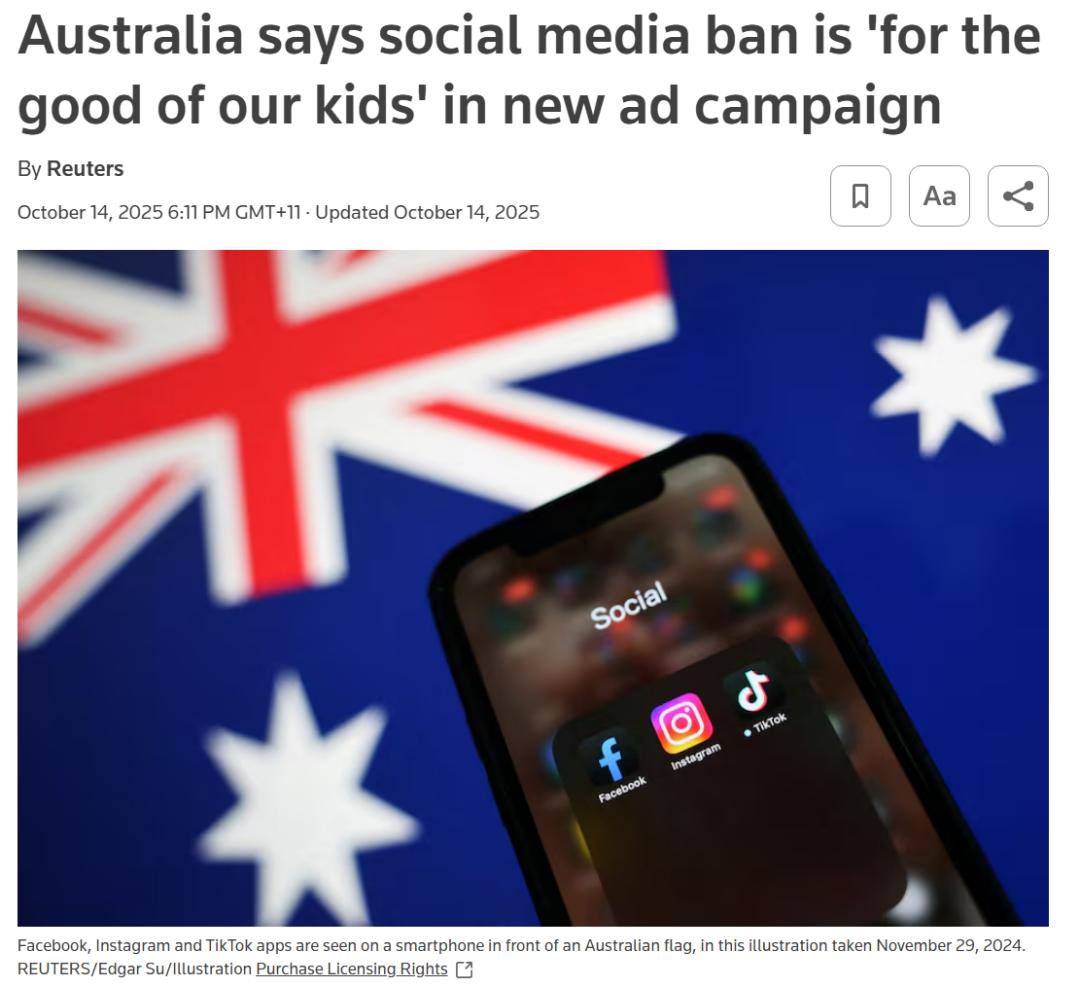 2024年12月,澳大利亚通过法案,将使用社交媒体的最低年龄设定为16岁,并规定平台运营企业有义务阻止未满16岁的儿童使用多数社交媒体,相关企业必须在12个月内采取相应举措,违者将被处以最高4950万澳元(约合人民币2.3亿元)的罚款。