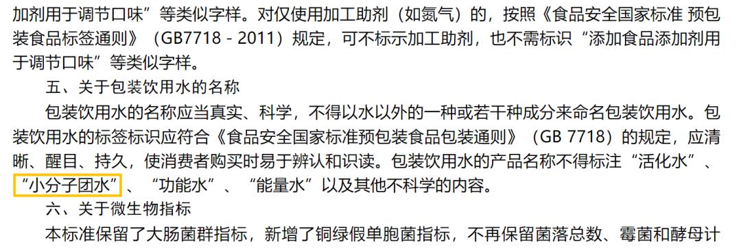 如果用户们有心搜索一下新闻,就发现一件惊人的事情,早在2015年时,国家就因为饮用水营销中存在大量误导和夸大宣传,禁止产品标榜功能性,除了天然矿泉水外,市面上在售的包装饮用水只分为饮用纯净水和其他饮用水两类,即不是纯净水就归结为其他类饮用水,“蒸馏水”、“活化水”、“功能水”、“能量水”等稀奇古怪的名称,一律不得出现在包装上,当时被点名的反面教材中,也有“小分子团水”。