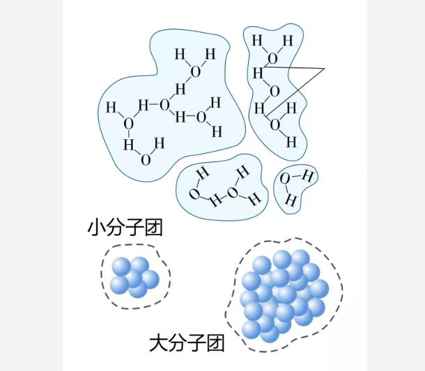 什么叫小分子水呢?按照推广视频里面的说法,普通的水,往往是由15到20个水分子,通过氢键作用聚合在一起而形成的分子团簇,这种形态被称为大分子团水。在某些情况下,连接力较弱的氢键将会被切断,使分子团簇散架,变成更小的水分子团,只有5到6个分子组队,具有更高的活性,更容易穿透细胞膜,从而带来各种“健康益处”。