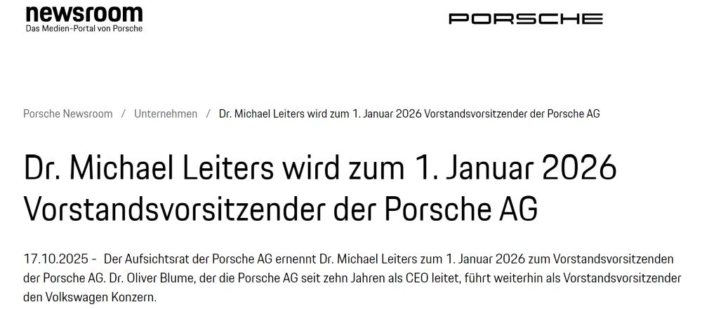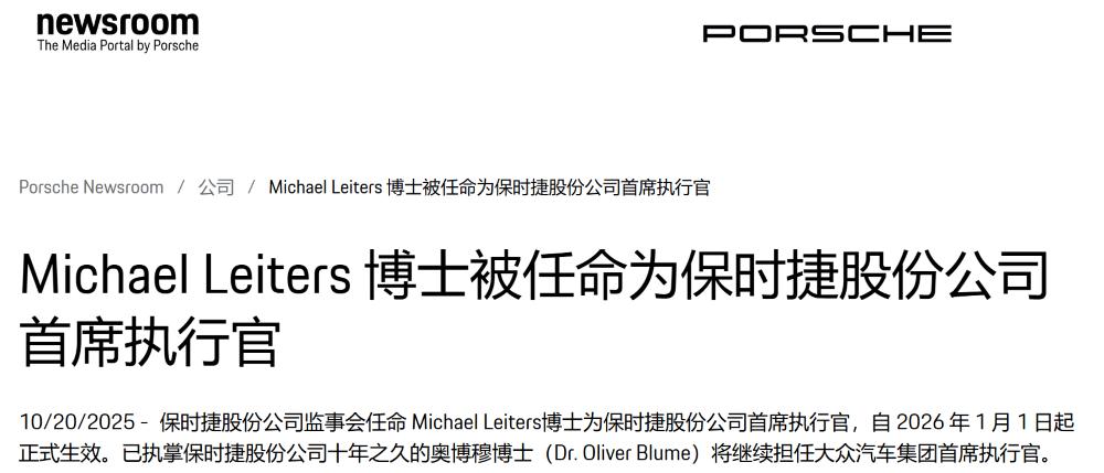 车东西10月20日消息,当地时间10月17日,保时捷股份公司(Porsche AG)监事会宣布任命迈克尔·莱特斯(Michael Leiters)为保时捷股份公司CEO(首席执行官),自2026年1月1日起正式生效,已执掌保时捷股份公司十年之久的奥博穆(Oliver Blume)将专职担任大众汽车集团CEO。