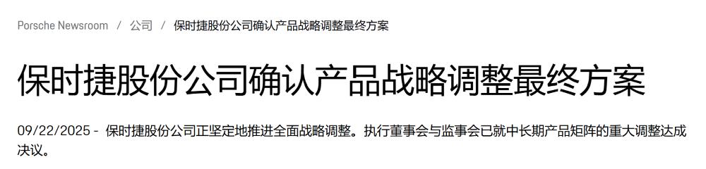 面对业绩压力,今年9月22日,保时捷宣布重大战略调整,表示将重新向燃油和混合动力车型倾斜,同时放慢电动化步伐。保时捷方面表示希望通过此项战略为中长期财务业绩带来积极影响。