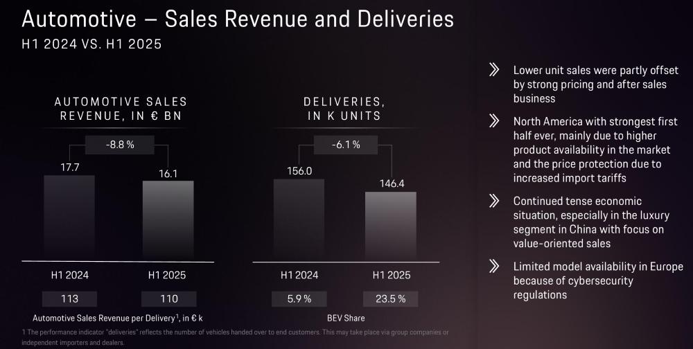 从汽车业务来看,保时捷2025年上半年的营业收入为161亿欧元(约合1336亿人民币),同比减少8.8%,交付量由15.6万辆同比减少6.1%至14.64万辆。