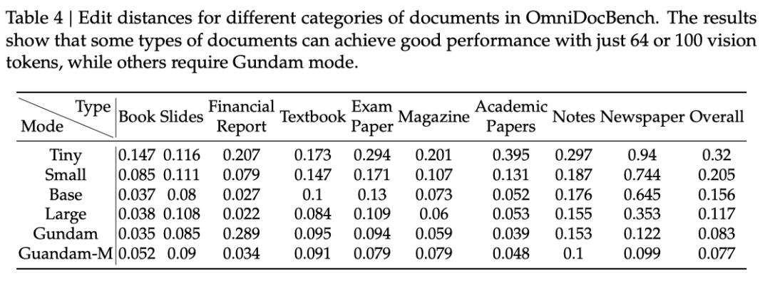 如下表4所示,某些类型的文档,只需要非常少的token即可获得令人满意的性能。