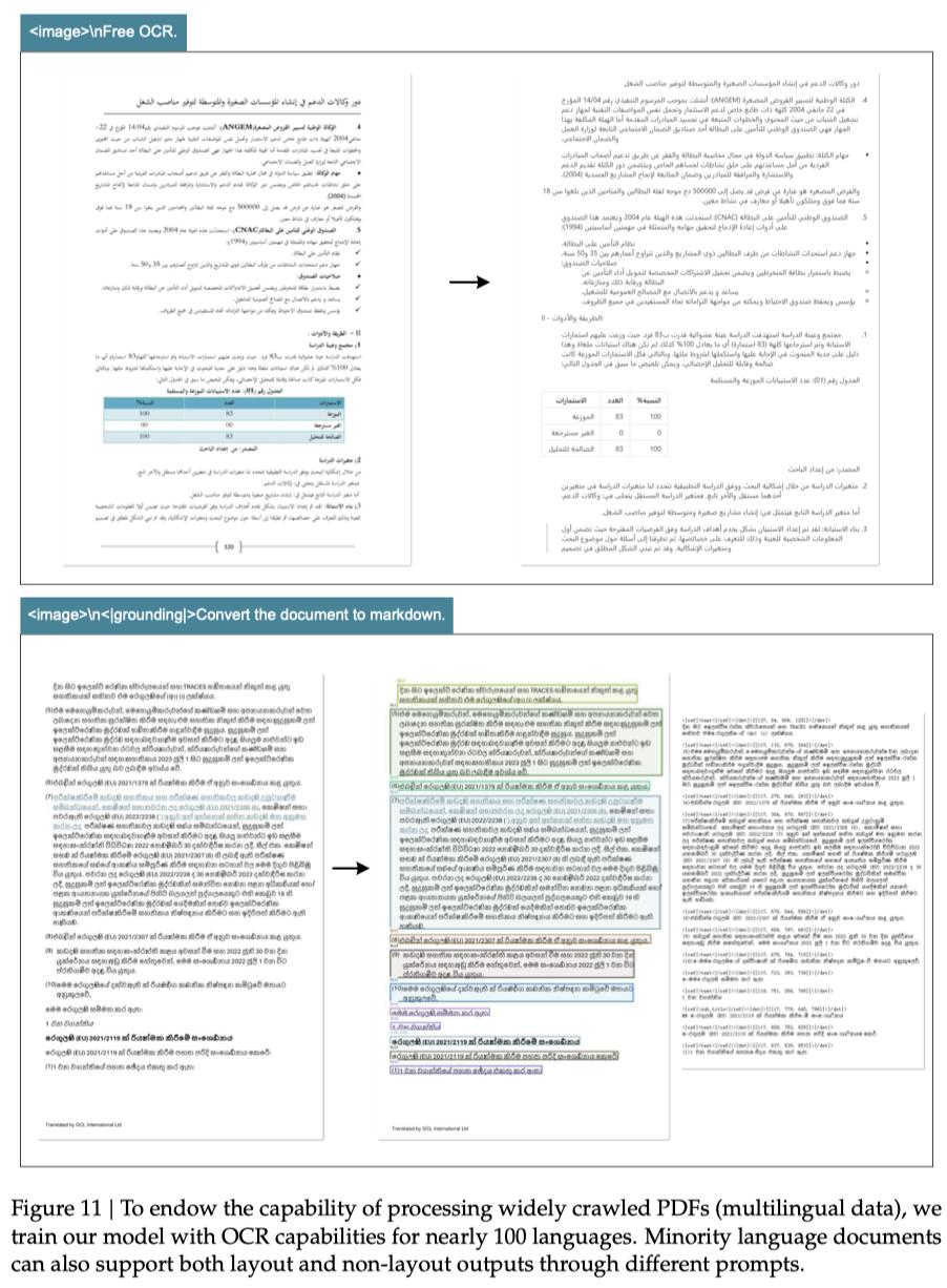如下图11所示,DeepSeek-OCR不仅在常见语言处理上表现出色,而且在多语言处理能力上也具有广泛的适用性,进一步增强了其在全球范围内的应用潜力。
