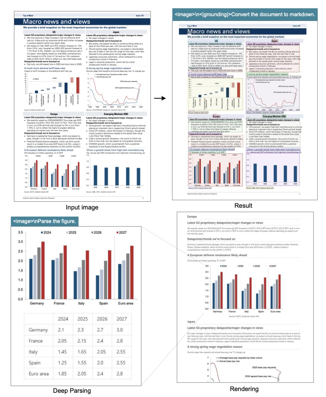 值得注意的是,Gundam-master模式(1024×1024的局部视图+1280×1280 的全局视图)是通过在已训练的DeepSeek-OCR模型上继续训练得到的。