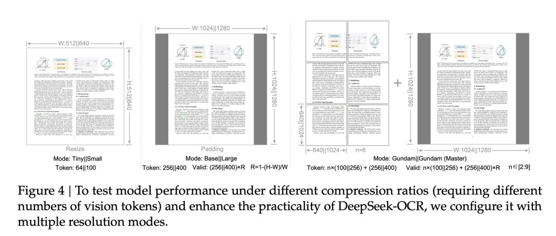 研究者设计了多个分辨率模式,以便在模型训练过程中同时支持多种分辨率,从而实现单个DeepSeek-OCR模型支持多个分辨率的能力。