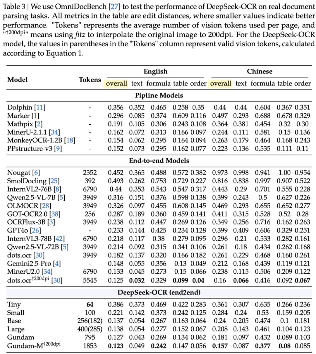 为了量化OCR性能,研究者在OmniDocBench上测试了DeepSeek-OCR,结果如表3所示。