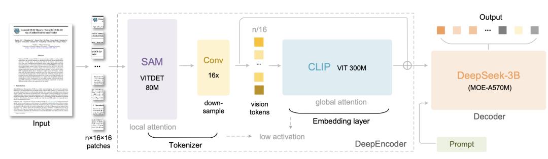 编码器(即DeepEncoder)负责提取图像特征,并对视觉表示进行token化与压缩处理。解码器则根据图像token和提示信息生成所需结果。