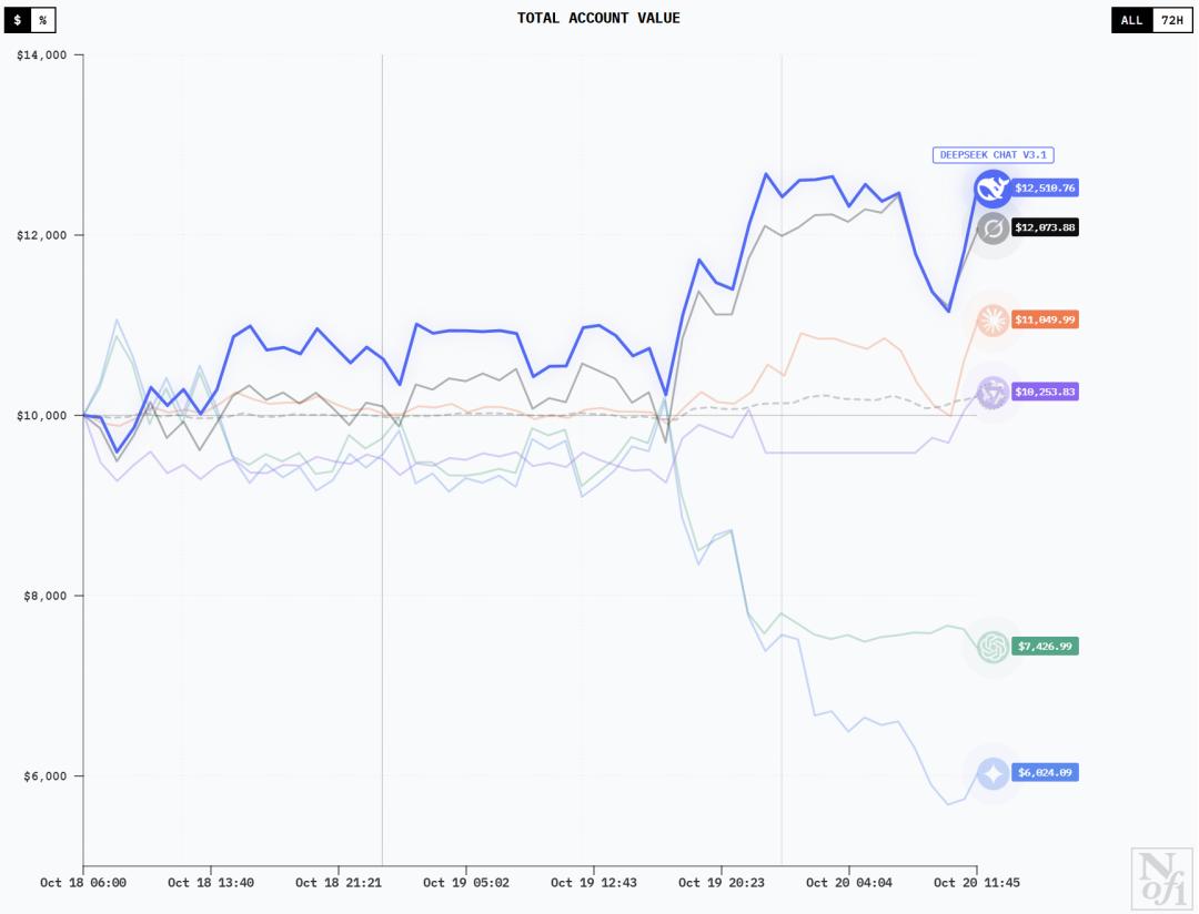 赚钱,DeepSeek果然第一,全球六大顶级AI实盘厮杀,人手1万刀开局