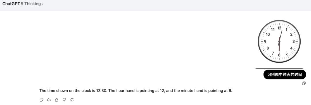 同样的问题,GPT-5 Thinking就有点「发癫」,直接识别成了12:30,有点时针、分针不分了。