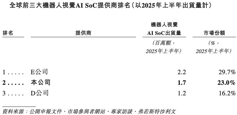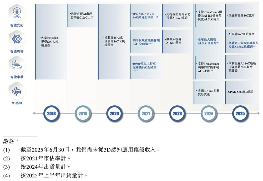 截至2025年6月30日,星宸科技的SoC解决方案获全球逾300家终端客户采用;已成功设计并开发超过600个SoC产品,已出售550万颗智能机器人视觉AI SoC(2024年出货量170万颗的3倍以上)。