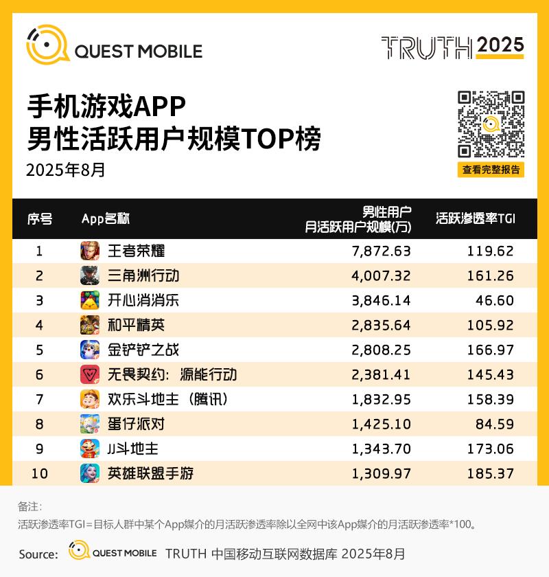 QuestMobile数据显示,截止到2025年8月,手机游戏APP行业月活用户规模达到6.98亿,同比增长了7.9%,人均单日使用次数和时长分别达到23次、114.4分钟,抢占了用户深度沉浸式娱乐时间;同时,微信小游戏、抖音小游戏月活用户规模分别达到5.71亿、1.71亿,成功抢占了用户的碎片化时间。