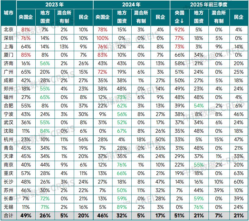表:22城2023年-2025年前三季度涉宅用地不同企业拿地金额占比情况(市本级)