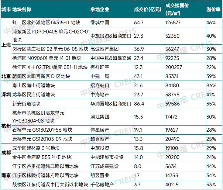 苏州、南京部分优质地块房企举牌积极,如苏州工业园区双湖地块经49轮竞价,成交楼面价达65242元/㎡,刷新江苏省地价纪录;南京鼓楼区汉中门大街地块经89轮竞价,成交楼面价40215元/㎡,刷新鼓楼区地价最高纪录。