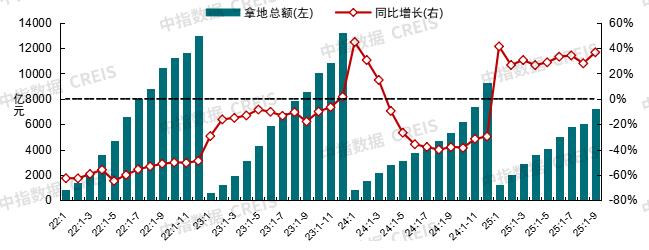 2025年1-9月,拿地金额TOP100企业拿地总额7278亿元,同比增长36.7%,增幅较1-8月扩大8.7个百分点。TOP100企业仍以央国企为主,拿地金额前十企业中8家为央国企,部分民企亦有一定投资强度,如滨江集团拿地金额位居前十,邦泰集团也进入拿地金额前二十。
