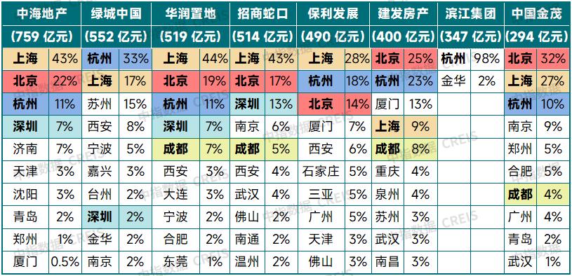 表:2025年前三季度拿地超200亿房企布局前十城市占比