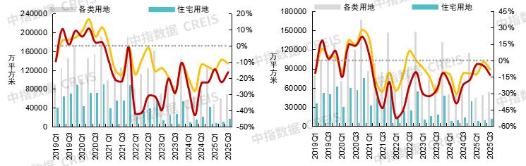 住宅用地:根据中指数据,推出方面,2025年前三季度,推出规划建筑面积为3.9亿平方米,同比下降17.9%;三季度推出1.8亿平方米,同比下降16.4%,同比增速持续回落。成交方面,2025年前三季度,300城成交规划建筑面积为3.0亿平方米,同比下降8.1%;三季度成交1.2亿平方米,同比下降13.2%,降幅较二季度扩大8.4个百分点。出让金方面,2025年前三季度,300城出让金为1.33万亿元,同比增长11.6%;三季度成交4635亿元,同比下降10.0%,季度出让金增速由正转负。
