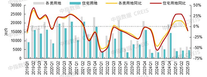 各类用地:根据中指数据,推出方面,2025年前三季度,推出规划建筑面积为17.8亿平方米,同比下降11.3%;三季度推出7.0亿平方米,同比下降10.9%。成交方面,2025年前三季度,300城成交规划建筑面积为14.7亿平方米,同比下降7.4%;三季度成交5.3亿平方米,同比下降8.1%。出让金方面,2025年前三季度,300城出让金为1.86万亿元,同比小幅增长3.1%;三季度成交6634亿元,同比下降10.4%。