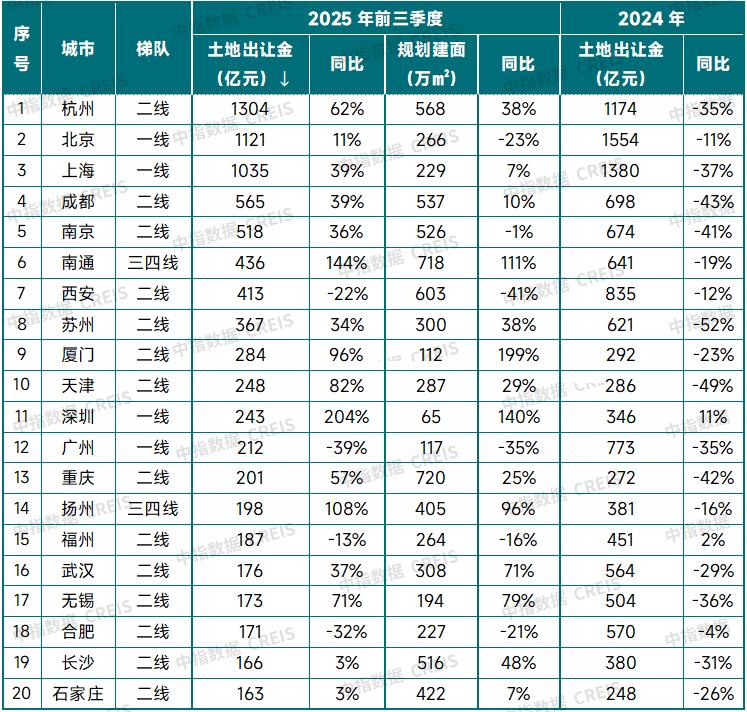 表:2024年及2025年前三季度全国住宅用地出让金TOP20(全市)