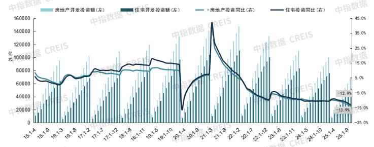 房地产开发投资额:1-9月,全国房地产开发投资额为6.77万亿元,同比下降13.9%,降幅较1-8月扩大1个百分点;其中,住宅开发投资额5.20万亿元,同比下降12.9%。