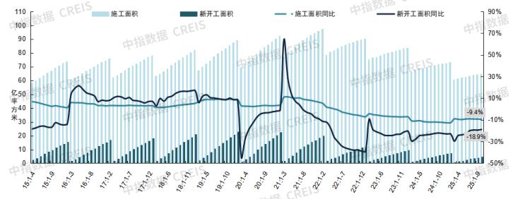 房屋施工面积:1-9月,全国房屋施工面积为64.86亿平方米,同比下降9.4%,降幅较1-8月扩大0.1个百分点;其中,住宅施工面积为45.22亿平方米,同比下降9.7%。