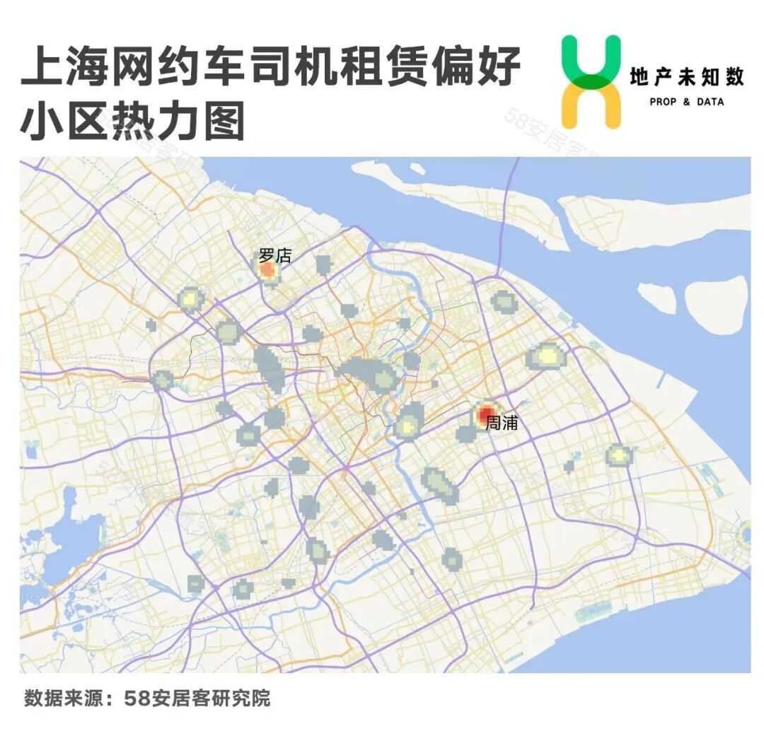 我们将上海网约车司机浏览比较多的小区做成热力图,可以看到两个明显的热区,周浦以绝对优势拿下上海网约车司机找房热点榜第一名,罗店紧随其后,成为第二名。