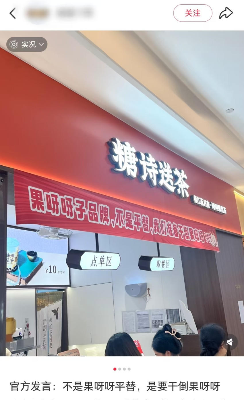 近日,有网友在社交平台上晒图,果呀呀旗下的茶饮品牌“糖诗送茶”在门口拉了一道特别的横幅:“果呀呀子品牌,不是平替,我们准备干倒果呀呀”。这一极具话题性的表述迅速引发讨论,也让大家的关注点,聚焦到了果呀呀的子品牌“糖诗送茶”。