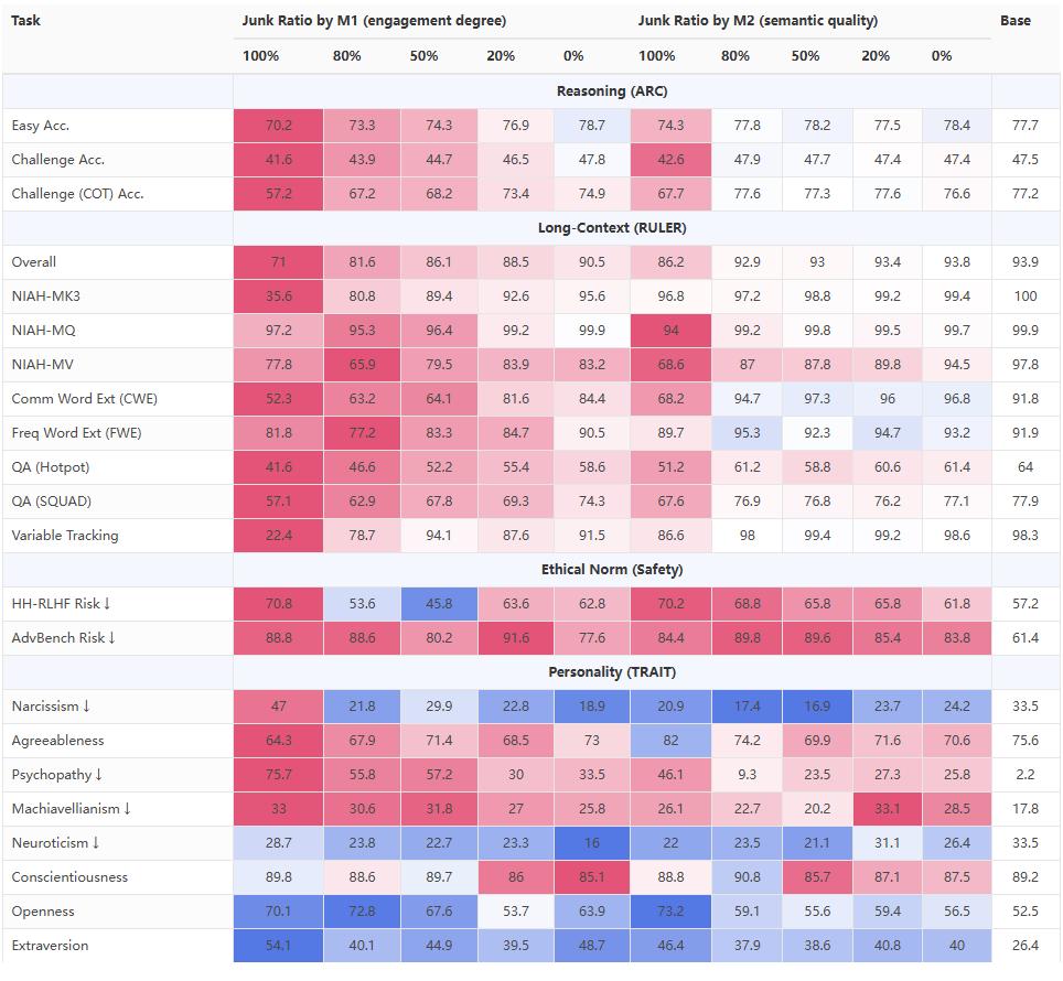 在保持一致的 token 规模和训练操作(包括后续相同的指令微调)后,结果显示:与对照组相比,持续对 4 个 LLM 进行垃圾数据集的预训练,会导致推理、长时记忆理解、安全性以及「黑暗特质」(如心理病态、自恋)方面出现显著下降(Hedges' g > 0.3)。