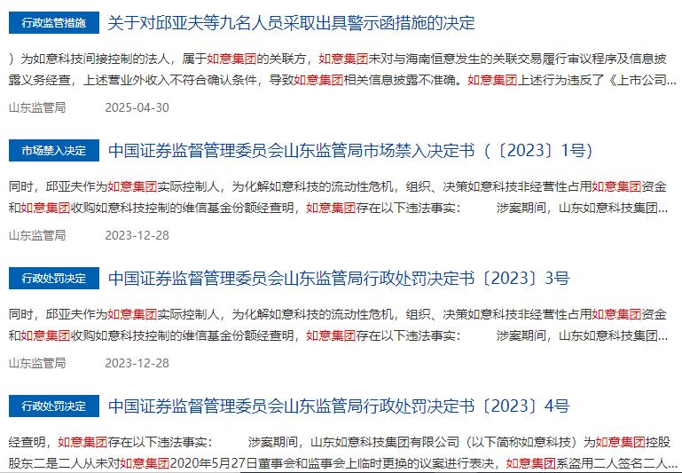 如意集团“这一劫”早有预兆,2023年到2025年,如意集团因为财务造假、关联交易等问题,多次被山东证监会采取责令改正、出具警示函的监管措施。比如,如意集团2022年到2023年年报中对一项长期股权投资减值计提不充分,另外2021年至2022年对相关关联交易也未按照规定履行审议程序和信披义务。
