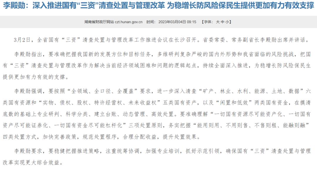 但到了2023年初,画风突变。李殿勋提出的"三个尽可能",把原本温吞的"盘活存量",升级成了"三资改革"。从"可以做"到"尽可能做",从"鼓励试点"到"全领域、全口径、全覆盖"。