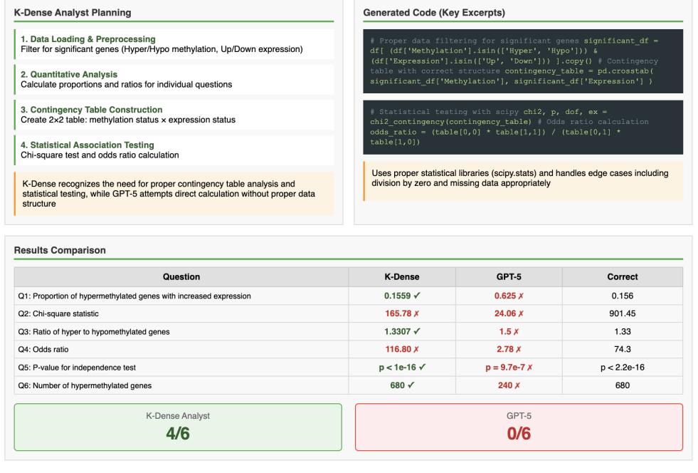举个例子:在RNA甲基化数据分析任务里,K-Dense Analyst能分步骤完成数据过滤、定量分析、列联表构建和卡方检验,而GPT-5连基本结构都没搭好。