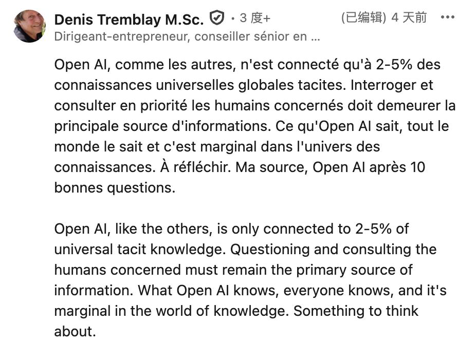 Open AI和其他类似系统一样,只连接到全球2%至5%的隐性知识。向人类进行提问与咨询,仍应当是信息的首要来源。
