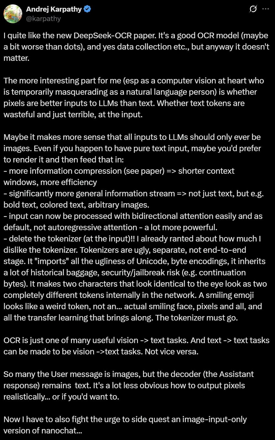 Karpathy相当喜欢DeepSeek-OCR的新论文。