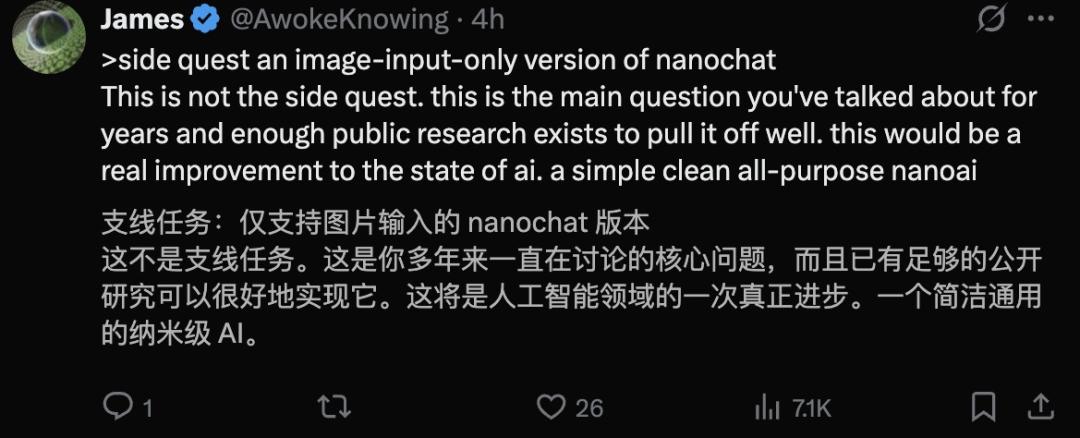 帖子下面,网友恳求Karpathy:快搞个只用图像输入的「nanochat」吧!
