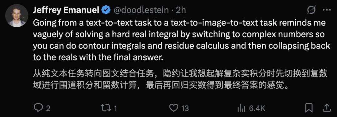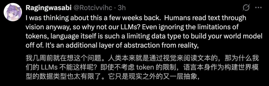 但更有趣的部分在于,对于大语言模型来说,像素输入是否优于文本输入?在输入端,文本Token会不会是一种既浪费又糟糕透顶的方式?
