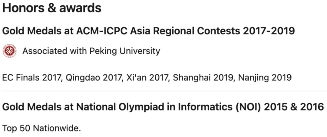 他代表北京大学参赛,获得ACM-ICPC 亚洲区域赛金牌(2017–2019),获奖赛区包括:EC 总决赛 2017、青岛 2017、西安 2017、上海 2019、南京 2019。