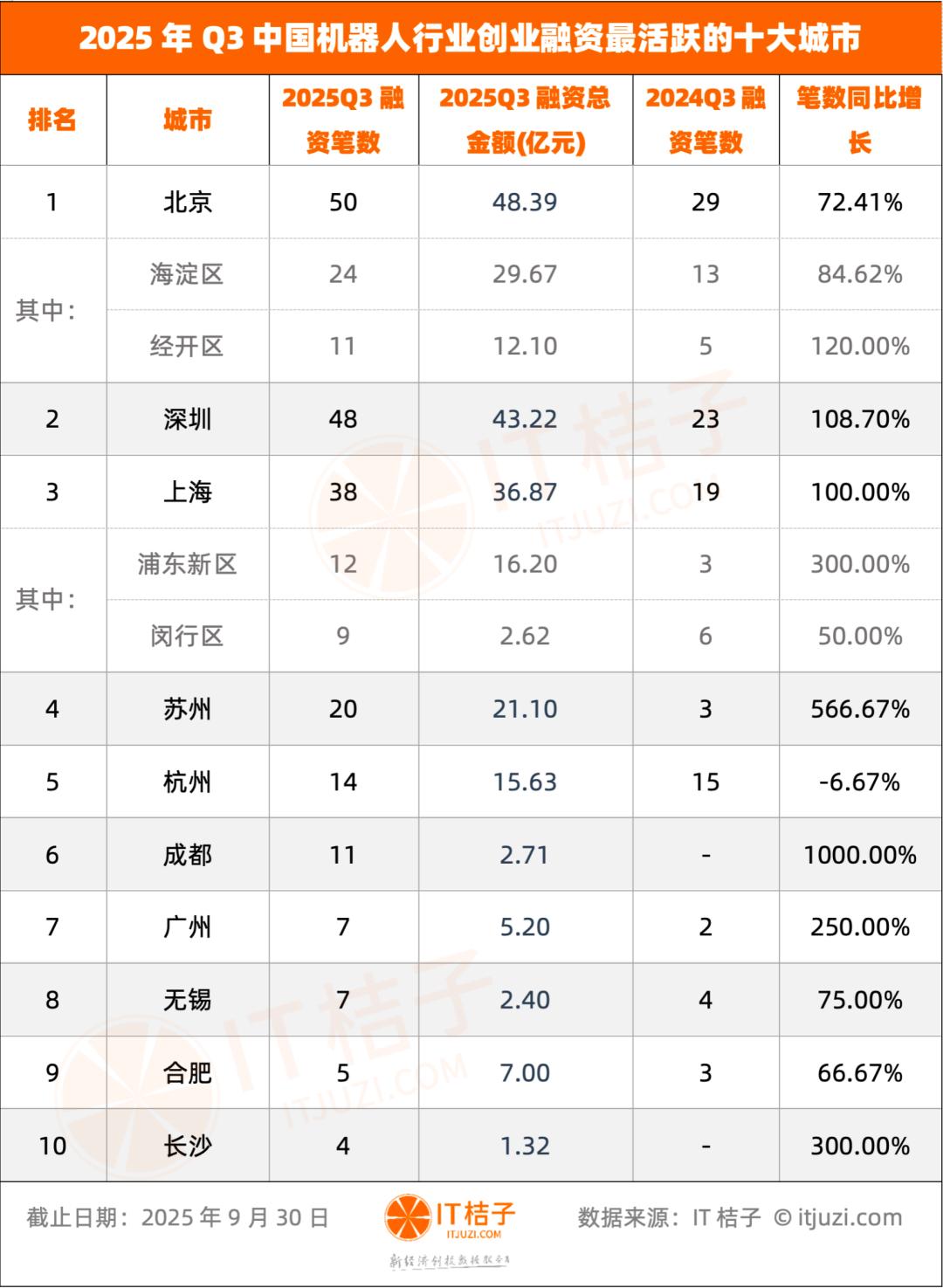 城市分布上,今年三季度,国内机器人融资主要集中于北上深(稳居前三),及长三角城市,显示出其在政策、人才与产业链方面的综合优势。